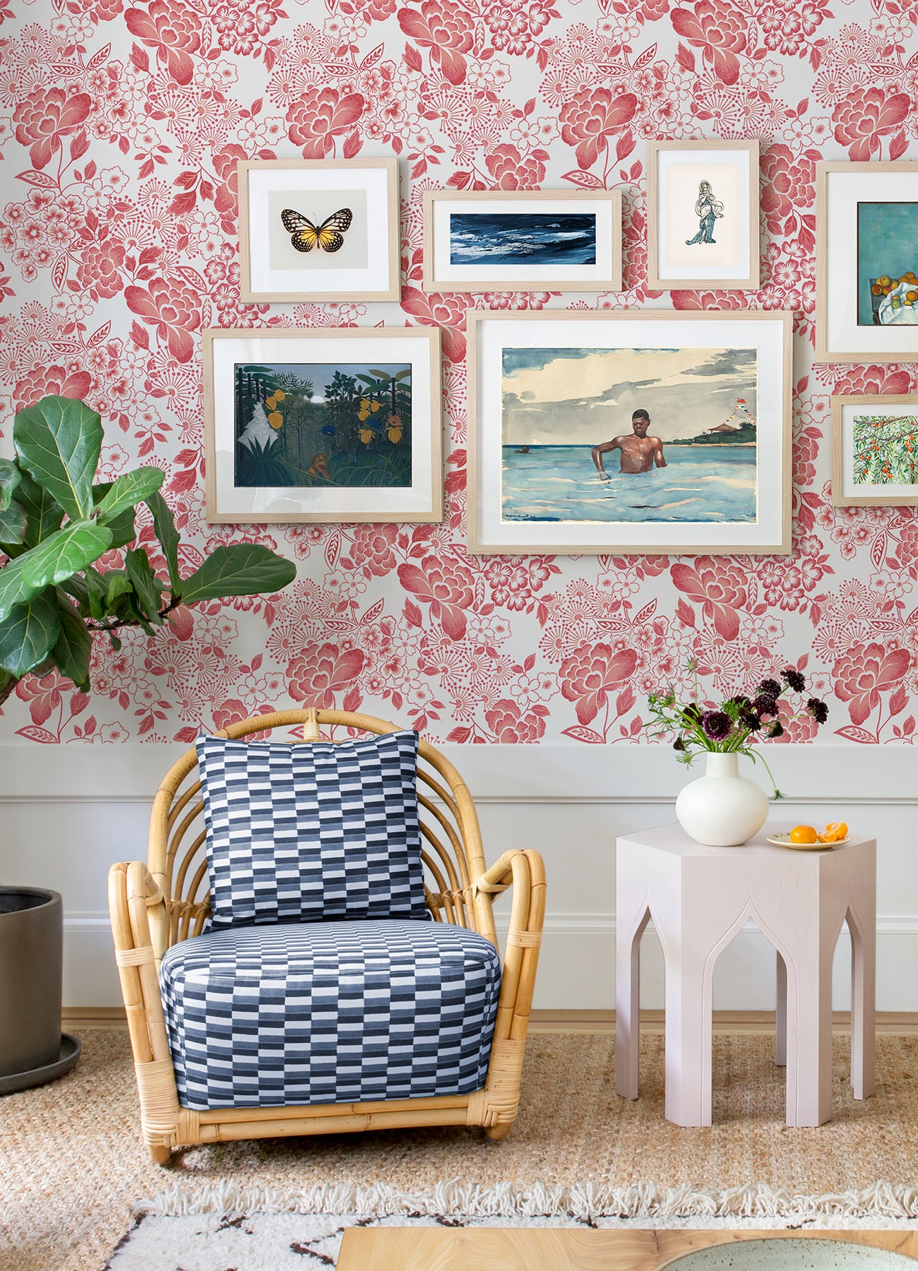 This dreamy floral wallpaper is bursting with romantic charm. A variety of small and large blooms are inked in shades of coral-pink against a crisp white backdrop. Irina is an unpasted, non woven wallpaper.