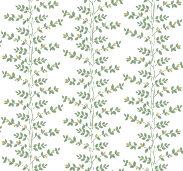 Climbing Vine is a design of delicate leaves growing in a botanical take on a vertical stripe, dotted with little flowers. Illustrated in shades of green, yellow, and white.
